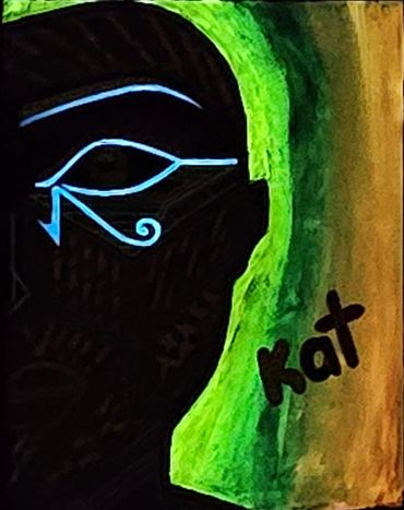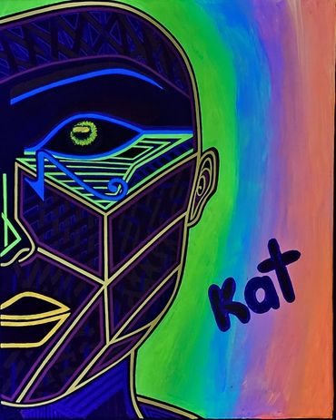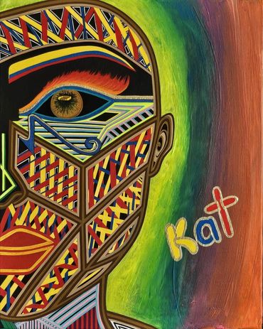 Kat's art serves as a philosophy that embraces darkness and invites us to transform it into beauty through catharsis, utilizing geometric designs and bold colors.